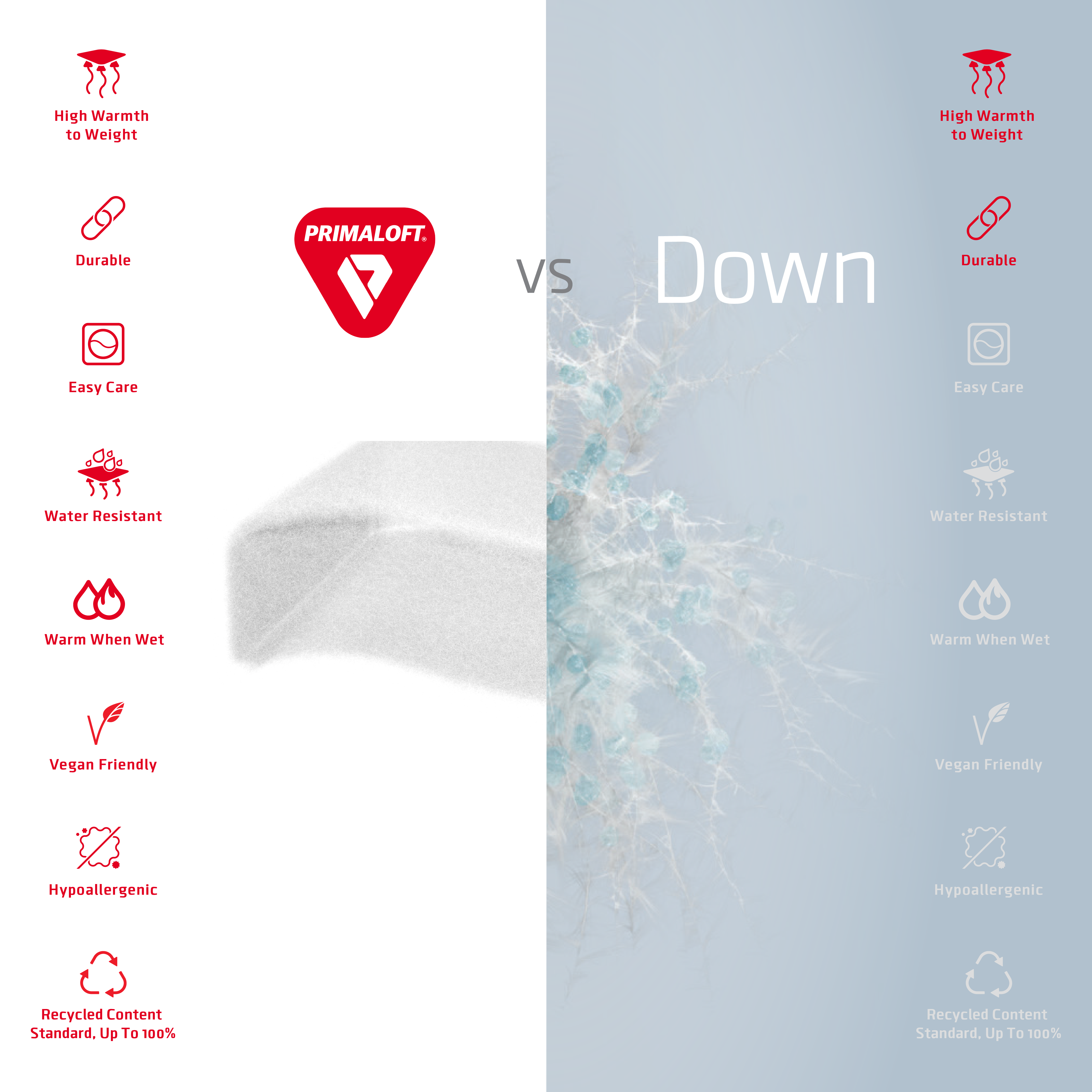Similar to the structure of down with incredible softness, Primaloft is highly compressible and easy to stuff.