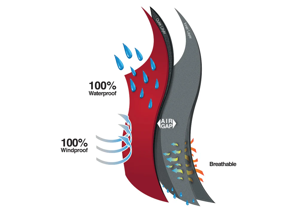 With this 2-layer system, an “Air Gap” is created which helps to build warmth, allowing for the body’s temperature to be regulated, minimising shivering when inactive.