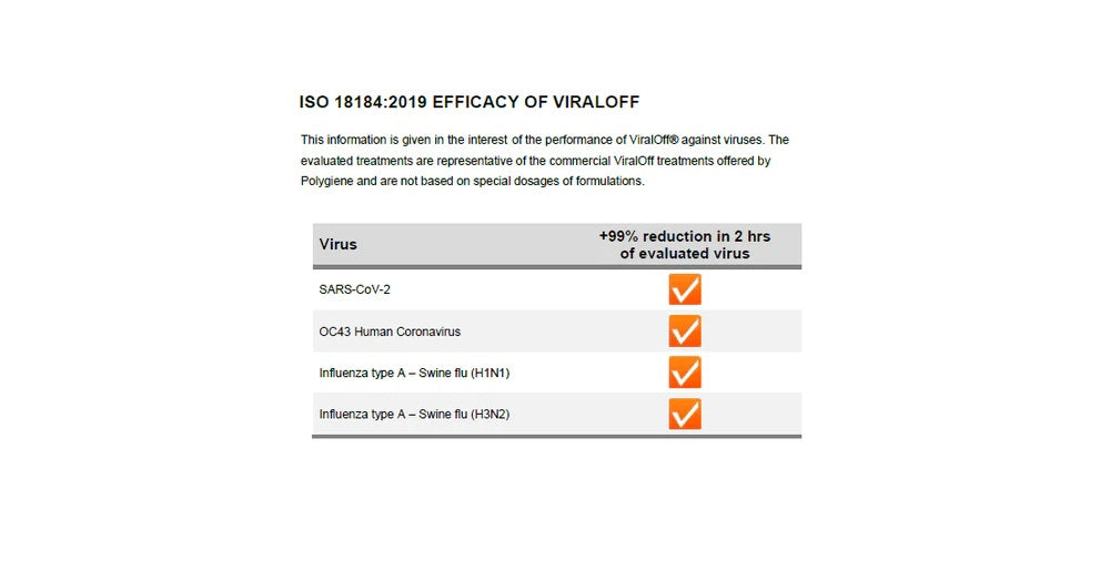ViralOff has a 99% reduction of viruses, in a textile or material, over two hours, according to a standard ISO18184:2019 test.